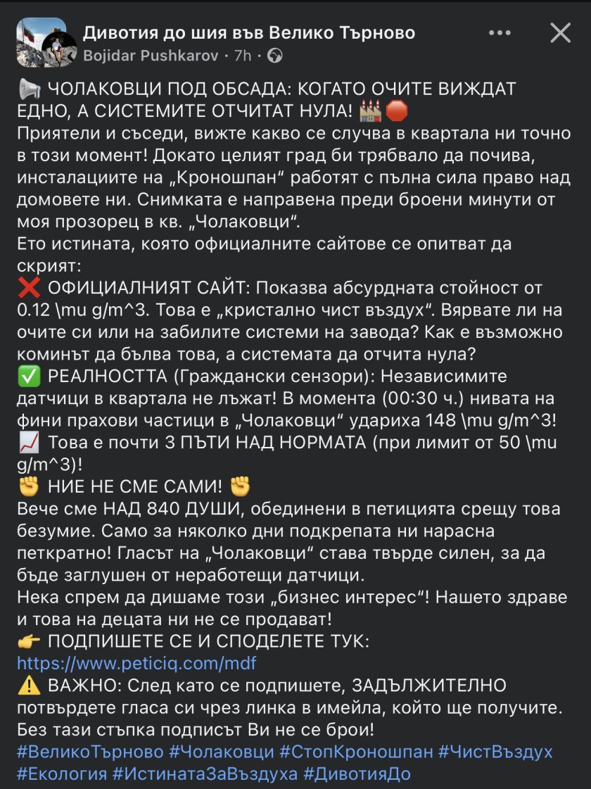 Недоволството в квартала вече се превръща в организирана гражданска кампания. Над 740 души са подписали петиция срещу замърсяването. Според тях броят на подписите се увеличава ежедневно. Те настояват за реални измервания на качеството на въздуха. И за пълна прозрачност на данните.