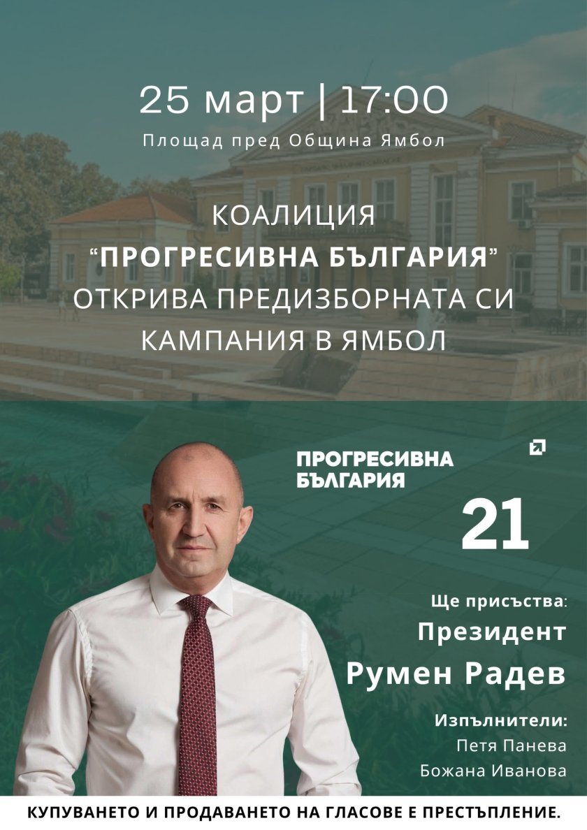 Лидерът на „Прогресивна България“ Румен Радев ще открие официално предизборната кампания на коалицията за 31 МИР – Ямбол.