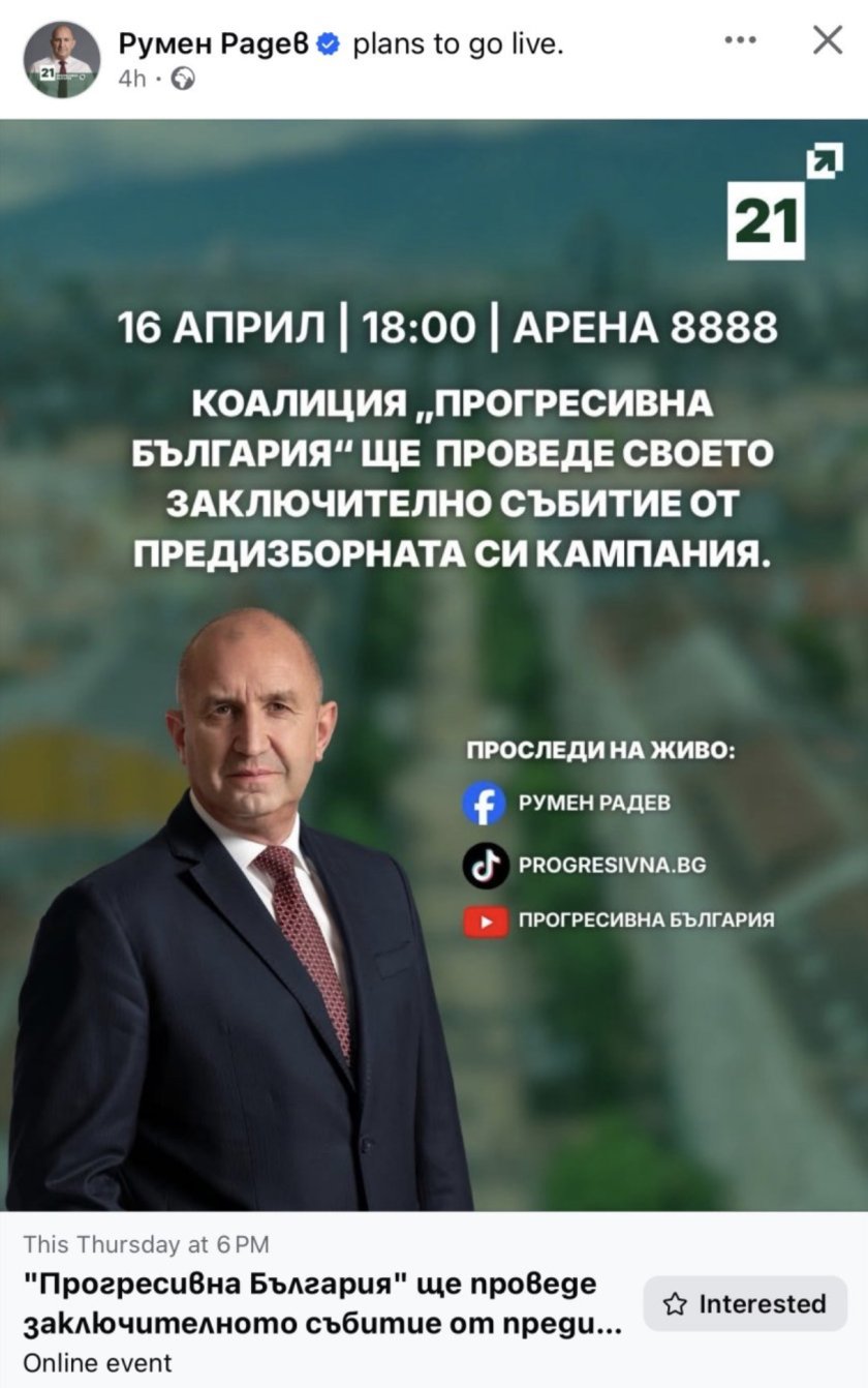 Коалиция „Прогресивна България“ ще проведе своето заключително събитие от предизборната си кампания на 16 април 2026 г. (четвъртък) от 18:00 ч. в Арена 8888 в София.