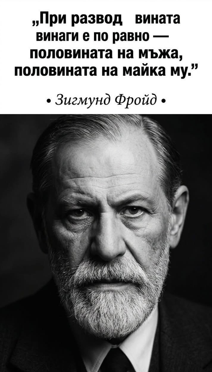 Макар фразата на Фройд да звучи провокативно, тя не бива да се тълкува буквално. Тя по-скоро насочва вниманието към факта, че личната история играе съществена роля в отношенията. Разводът рядко е резултат от едно действие или една страна. Това е процес, в който участват множество фактори – лични, емоционални и социални. Разбирането на тези механизми може да помогне за по-добра оценка на ситуацията. То дава възможност за осъзнаване, което често липсва в моменти на силно напрежение.