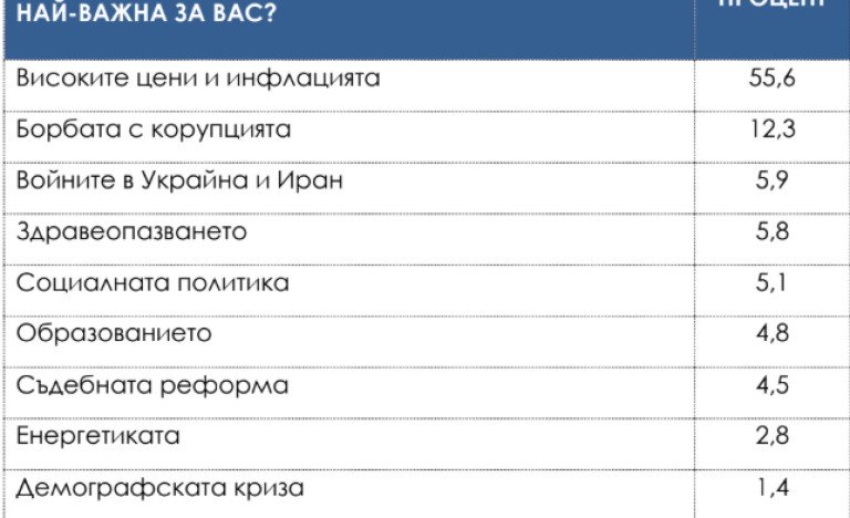 Резултатите от изследването сочат, че темата за високите цени и инфлацията се е превърнала в ключова за предизборната кампания. За повече от половината избиратели това е най-важният въпрос. Това е така, след като 69,8% от пълнолетните българи се опасяват, че вследствие на кризата материалното им положение може да се влоши до степен, че ще са затруднени да се издържат. Едва около 1/4 смятат, че няма да се стигне дотам. Това означава, че повечето хора се чувстват на ръба, поради което търсят сигурност и промяна на статуквото.