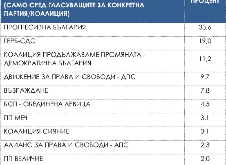Подкрепата за отделните политически сили показва една сравнително устойчива картина в последния месец. Лидер е политическият проект на бившия президент Румен Радев. Регистрира се покачване на резултата на "Прогресивна България", което показва, че кампанията им дава положителен резултат с тенденция за развитие.