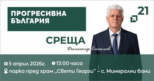 Днес, 5 април 2026 г. (неделя), от 13:00 часа в центъра на село Минерални бани, Хасковска област, ще се проведе открита обществена среща на коалиция „Прогресивна България“. Събитието ще се състои в парка пред храм „Свети Георги“ и е част от предизборната кампания за парламентарните избори на 19 април.