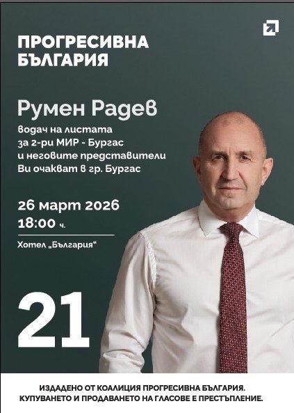Лидерът на „Прогресивна България“ Румен Радев ще даде официален старт на предизборната кампания на коалицията в Бургас. Събитието ще се проведе на 26 март от 18:00 часа в конферентната зала на хотел „България“.
